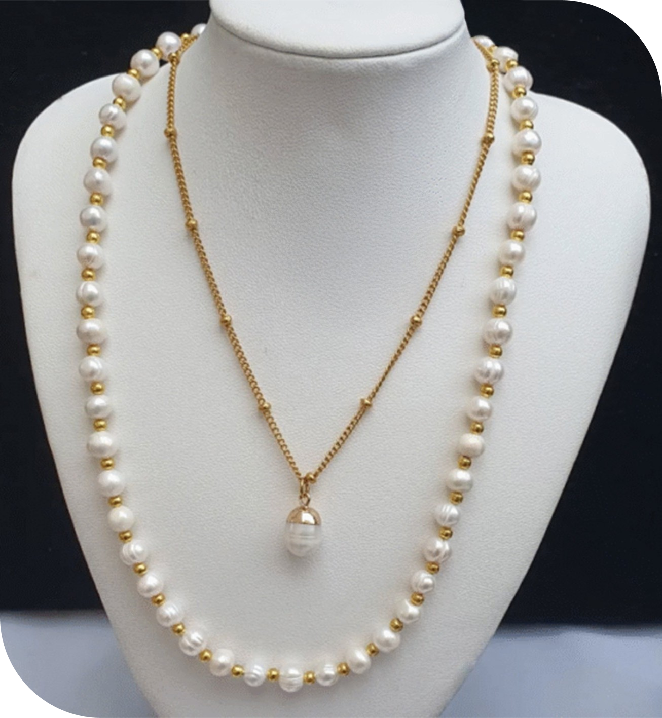 Cette association harmonieuse marie la délicatesse des perles nacrées à la finesse d’une chaîne dorée ornée d’un pendentif perlé.